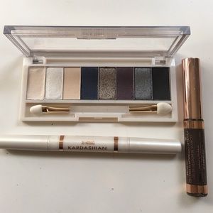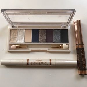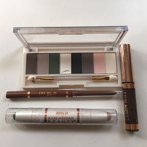 Kardashian Beauty Makeup Bundle. 2 Bundles to choose from (left to right from picture #1). SOLD: Bundle #1: Neutral Matte Eyeshadow pallet, Eyeshadow stick with 2 neutral colors, Brow gel, and eyebrow pencil. 2 AVAILABLE: Bundle #2 and #3: Neutral eyeshadow pallet, brow gel and lip stick/lip liner duo (pink). All products are new, none of the products were used, some of the products swatched, some of the eyeshadow may had to be repressed.