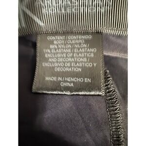 Kardashian Kollection black one piece romper shorts jumpsuit. The material is a very soft silky feeling nylon elastane blend. The front is a deep v wrap with a fixed cross at the waist. The waist is an elastic gathered waist with drawstrings for a cinched style. The shorts have a 3" inseam. The sleeves are a 3/4 length. The jumper is in excellent condition. Size large with Approximate measurements shown.
