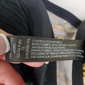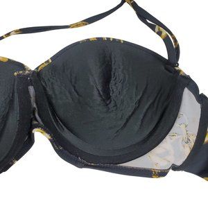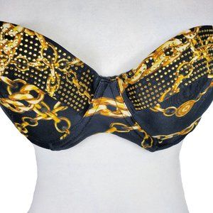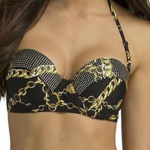 Black bikini top with gold stud embellishments and all over gold chain print. Adjustable/removable ties at neck - can also be worn strapless. Padded cups with underwire. Cups are not removable.