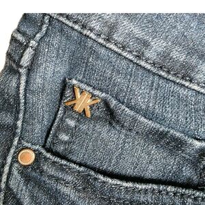Features: "KK" metal charm on the coin pocket, angular stitched design on back pockets, branded hardware.