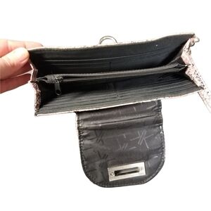 Silver toned hardware with fabric faux snakeskin design. Detachable wrist strap. One zipper compartment. Two longer pockets for bills behind 12 credit card slots.