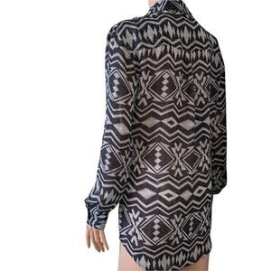 It features a semi-sheer design with a button-up front and a unique aztec print.