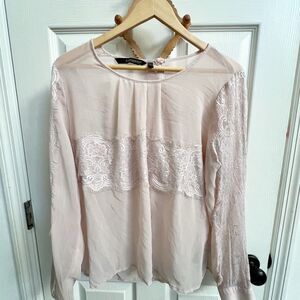 Elegant sheer blouse with lace detailing. Light pink color adds a soft touch.