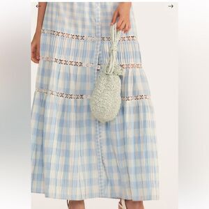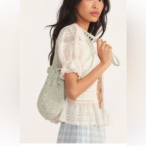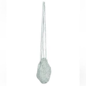 Our Karelia Bag is brand new in delicate hand macramé. This simple drawstring bag, perfect for everyday, has a double strand strap that cinches the sack purse and an interior pocket.