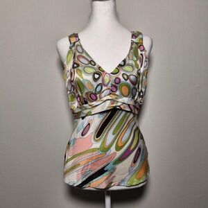 This Karen Arnold top is a beautiful representation of a bygone 90s era that had beautiful one of a kind pieces made of natural fibers. With a colorful, abstract / psychedelic pattern and ruffle accents, this sleeveless blouse features a V-neckline and wide straps for a comfortable fit. Made from lightweight and breathable chiffon silk, this blouse is easy to care for with its hand wash only instruction. Its whimsical uniqueness makes it one of a kind piece.