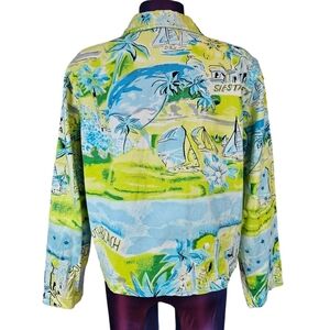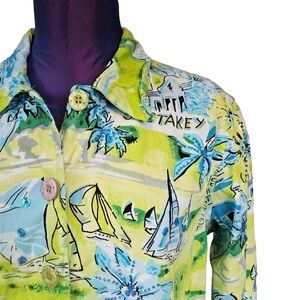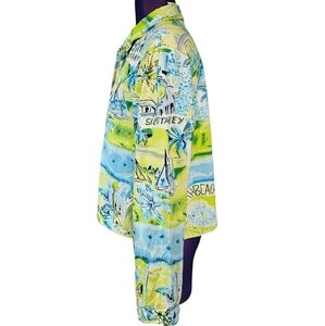 Features vibrant neon yellow and blue hues woven blazer lightweight jacket adorned with sail boats and beach, collared blazer, embellished with blue sequins, fun Siesta Key Floridian beach print, button front, long casual sleeve, snow bird attire, Floridian resort wear, Floridian style.