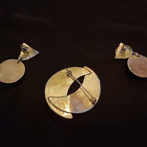 Absolutely gorgeous sterling silver pin and matching earring set, inlaid with onyx from designer Karen Joyce. The pin is 1.5" in diameter; earrings are 1.25" drop. The set is signed and dated 1992 by the designer herself, but a definite 1960s vibe here.