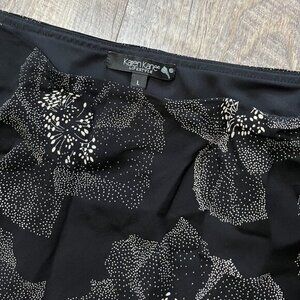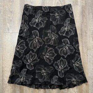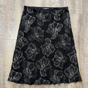 Elegant black midi skirt with white floral pattern. Perfect for any occasion.