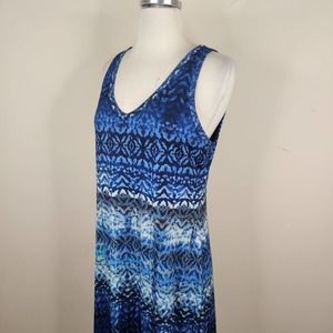 Stylish sleeveless dress. Features a blue patterned design. Perfect for casual outings.