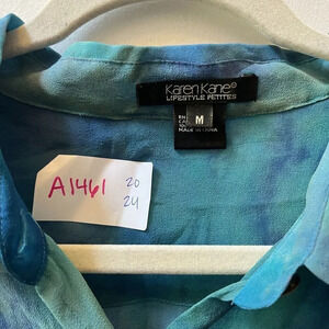 Karen Kane Womens Blue Silk Button Shirt M Petites Watercolor Summer Top. Measurements taken while flat. Chest: 20 in Length: 24 in In good pre-owned condition. Some marks near front buttons. See photos for details.