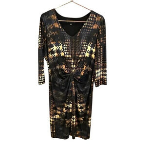Long sleeve blue and browns pattern dress, has black lining inside. Perfect for the colder months