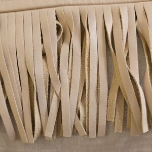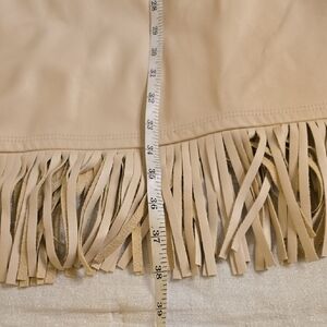 Polyurethane.Elegant cream midi dress. Features a V-neck and short sleeves. Fringe detail at hem adds flair.