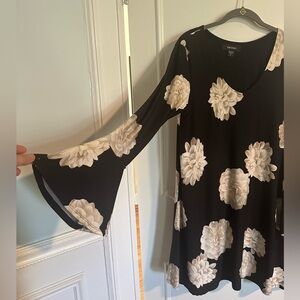 Fabulous little dress! Karen Kane short, stretchy and sassy black & white floral trapeze dress with built in slip. Bell-Sleeve and v-neck. This is a fun and flirty dress that goes anywhere. Wear it with boots, heels, sandals or sneakers. Super comfortable and super stretchy for my bodacious babes. Excellent condition. Made in the USA. Comes from a pet friendly home