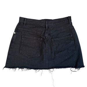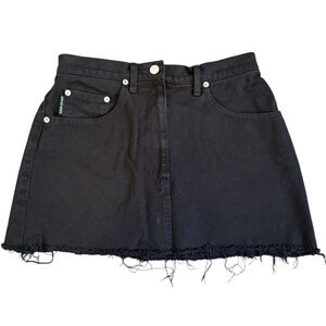 Classic meets edgy in this Karen Kane Easywear black denim mini skirt. Made from 100% cotton, it features a raw frayed hem that adds a trendy, lived-in vibe to its timeless silhouette. Designed with front and back pockets, belt loops, and a sturdy zip-button closure.