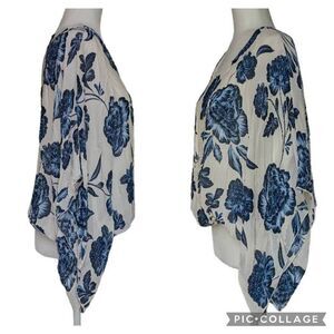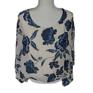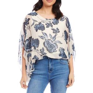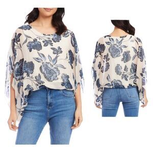 Karen Kane Floral Print Blouson Scarf Top Bohemian Flair Size L Crew Neck Blue