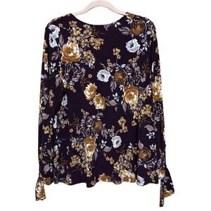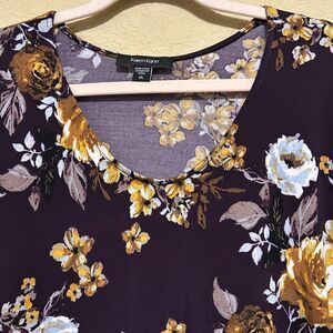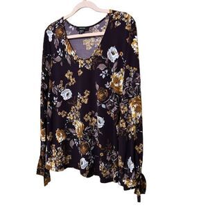 Karen Kane Floral Stretch Jersey Knit Top Women XL Tie Sleeve Purple Gold Autumn