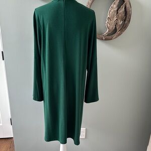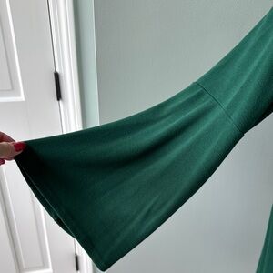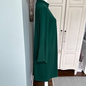 This elegant green dress by Karen Kane features a chic A-line silhouette with stylish bell sleeves and a sophisticated mock neck. Perfect for both casual outings and work settings, its soft fabric ensures comfort and effortless style. Made in the USA. Fabric is 63% polyester, 34% rayon, 3% spandex