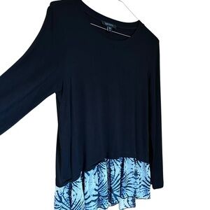 A soft lightweight pullover sweater with a delicate tier of a sheer blue print mixed with a crinkled solid hem for a modern layered look. Hand wash, line dry Made in the USA