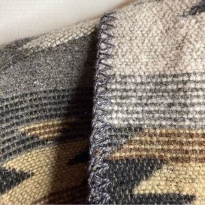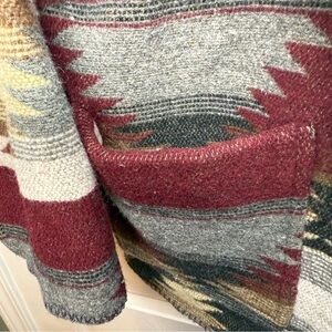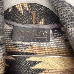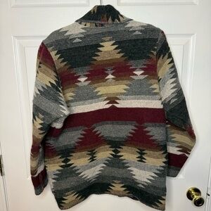 Stylish cardigan with a unique pattern. Features shades of gray, black, and tan.