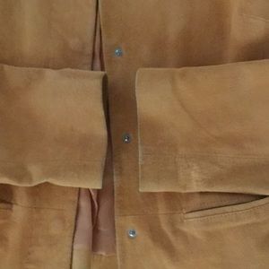 Karen Kane "Peachy"Suede jacket . Excellent condition . Hardly worn. Slight sign of being worn on sleeve edges and collar. Snap closure . 2 pockets . Interesting detail toward the bottom on the back. L measures approx 22 1/2 in from top of collar to bottom. Collar appears slightly lighter , but was like that New. It's more the angle. Picture 4 shows the color the best