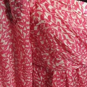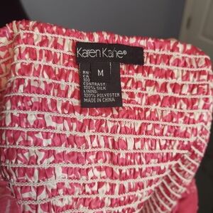 •Karen Kane Pink And White Blouse Size Medium. Has see through arms and they are puffy. Can tie in front and has a dip in the front. It's a super cute shirt. In good pre-owned condition. Bundle for a better price!