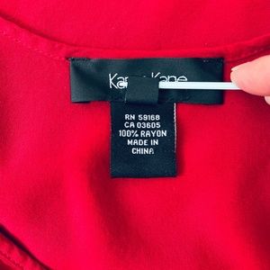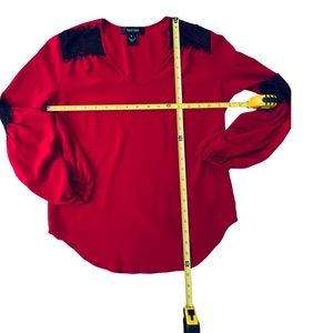 Karen Kane Red With Black Lace Rayon Blouse Sz XS, excellent pre owned condition with no flaws.