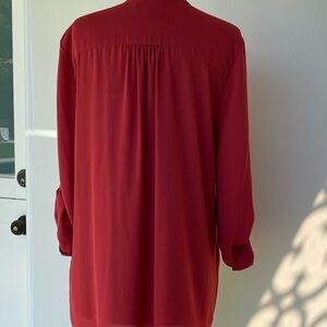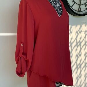 This beautiful blouse is 100% Polyester. It has sleeves that roll up and attach with a button. Back of blouse has gathers at top. Blouse is a hi/low.