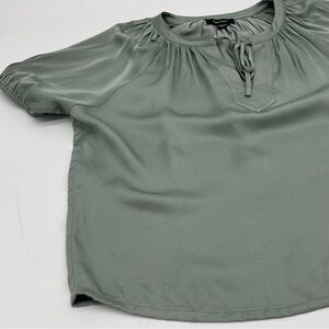 Karen Kane sage green short sleeve blouse in size Small. Features a split-neck with tie detail, gathered neckline, and soft fabric. Made in the USA with imported fabric.