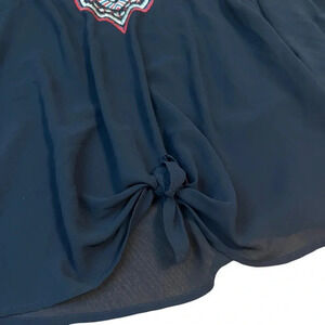 Navy sheer fabric with Americana print around the neckline. Tie waist in front.