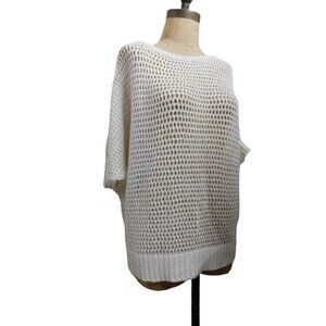 A stylish Karen Kane Size L woven crochet style knit top with short sleeves. Perfect for both casual and formal occasions. Scoop neckline, semi sheer woven knit fabric, draping style short sleeves, loose oversized fit