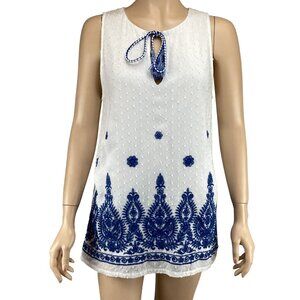 Karen Kane Sleeveless Top Size Medium White & Blue Embroidered With Tie Neck