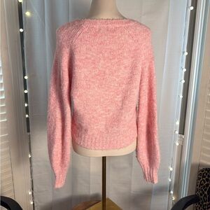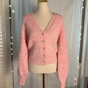 Chic and cozy pink cardigan. Features a V-neck and button-up front. Perfect for layering.
