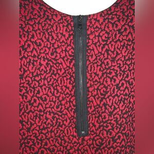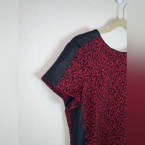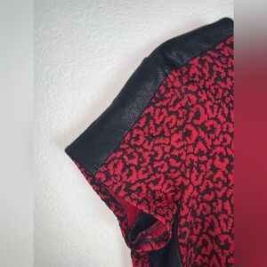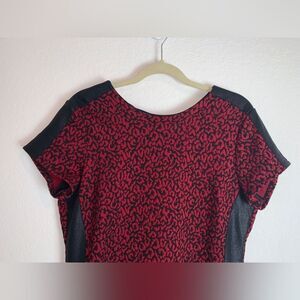 Elegant and striking, this dress combines bold red and black hues with faux leather side panels. Featuring short sleeves and