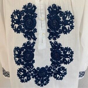 Karen Kane White Navy Peasant Style Embroidery Crochet Boho Flowy Top SZ L