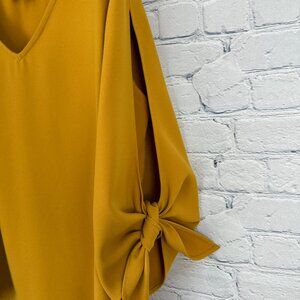 Karen Kane Women's Amber Wave 3/4 Length Open Slit Tie Cuff Sleeve V-Neck Pullover Blouse Top, Size Large, Mustard Yellow-Gold Color, 100% Polyester