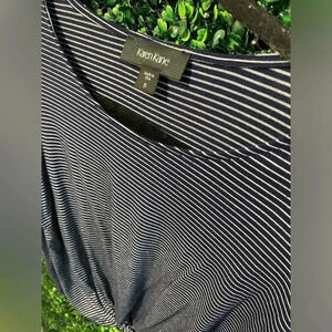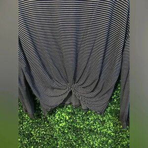 A playful knotted hemline adds stylish interest to this everyday top patterned in mixed-scale stripes. It's finished with billowy blouson sleeves.