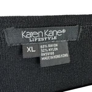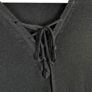Excellent preowned condition. Karen Kane Y2K Black Tight Knit Long Sleeve V-Neck Lace Up Neckline Pullover Sweater. Rayon/nylon material. Approx. measurements: Shoulder to hem 23", pit to pit 20", sleeve from neck to sleeve hem 29". Size XL.