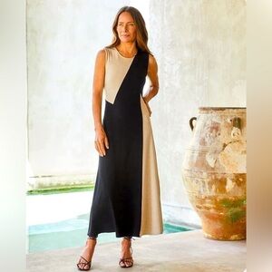 Karen Kane black/tan sleeveless color block midi dress. Rayon/Spandex. Washable. Great for travel, day or evening events. Size Small. NWT