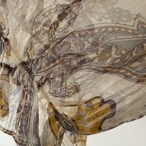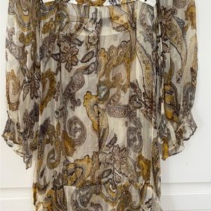 Karen Kane briwn gold silk floral sheer peasant tunic blouse. Size XL