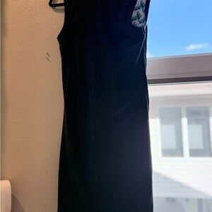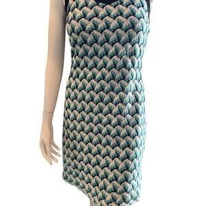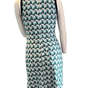 Effortlessly chic 💙 This Karen Kane sleeveless sheath dress features a bold teal and navy geometric fan print, contrasted with a solid black neckline and armholes. Made in the USA from a soft stretch knit fabric, it’s designed for comfort and a flattering silhouette. Perfect for work, brunch, or weekend outings — simply add heels or sandals for a complete look!