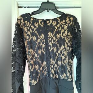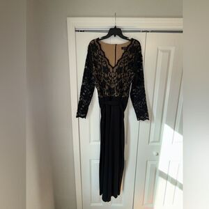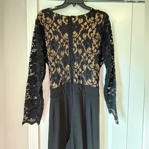Elegant black jumpsuit with lace detailing. Long sleeves. Flattering fit.