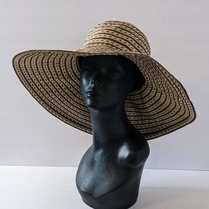This really beautiful large brim hat is perfect for the beach, pool party, cruise or vacation. It is made of polyester embroidered ribbon. It's timeless, classy and perfect for full sun protection of the face and neck!!