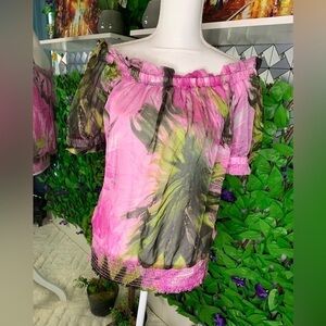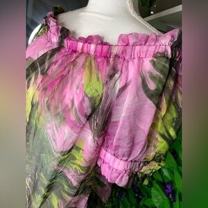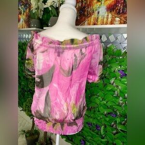 Karen Lane 100% Silk Women’s Small Off Shoulder Sheer Dusty Pink Floral Shirt