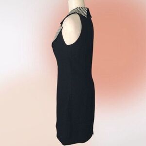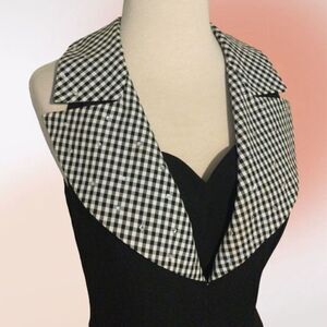 The Sleeveless Dress is Solid Black with a Sweetheart Neckline and a Black and White Check Lapel also Embellished with Rhinestones.
