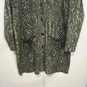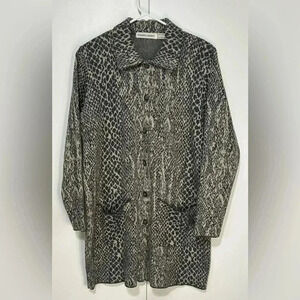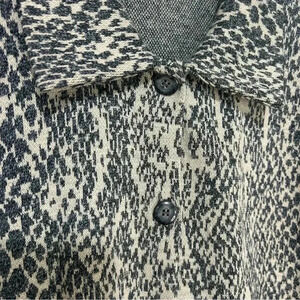 Good preloved condition Karen Lessly Women Sz Large Animal Print Long Sleeve Gray Cream Button Cardigan with shoulder pads and pockets.