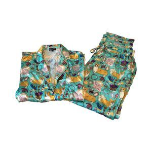 Karen Mabon Oh So Royal Turquoise Luxury Silk Pajama Set Corgi Queen Jewels L