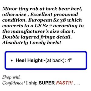 Karen Millen Black Fringe Suede Western Stiletto Heel Boot Bootie US Sz 7 EU 38 Minor tiny rub at back bear heel, otherwise , Excellent preowned condition. European Sz 38 which converts to a US Sz 7 according to the manufacturer’s size chart. Double layered fringe detail. Absolutely Lovely heels!