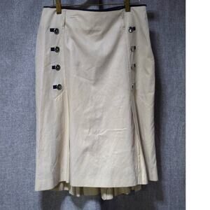 Elegant Karen Millen beige skirt featuring double rows of silver-tone buttons with navy loops for a nautical-inspired look. Tailored fit with subtle pleating for movement. Fully lined for comfort. A refined and versatile skirt perfect for work, evening, or smart casual styling.