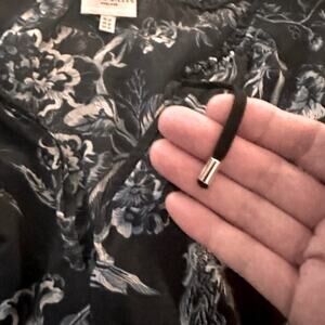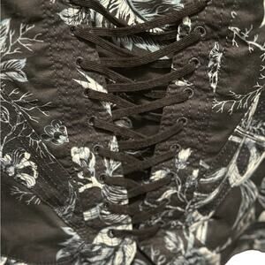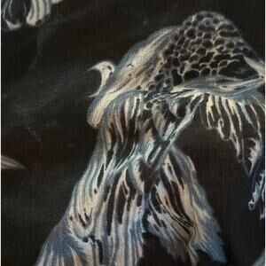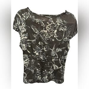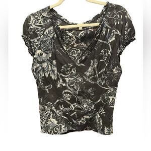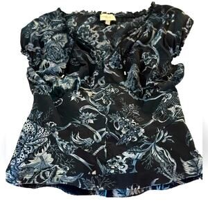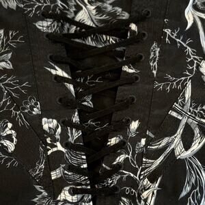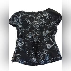 Gorgeous blouse by Karen Millen. Beautiful ruffled neckline and sleeves. Floral pattern with birds. Sheer v-neck bust. Fitted bodice. Black lacing detail in the back. Side zip closure. 97% cotton, 3% elastane. Lined. Excellent condition. Please see photos for measurements.