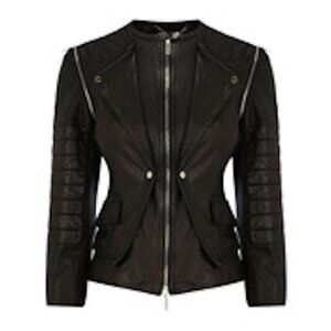 "Quilted paneled leather jacket with removable three quarter sleeves with Karen Millen branded metal work. A black leather jacket is a wardrobe staple that can be worn again and again. Wear with your favorite jeans or give a dress an edge. Also zip off the sleeves on those hotter days and wear as a vest."